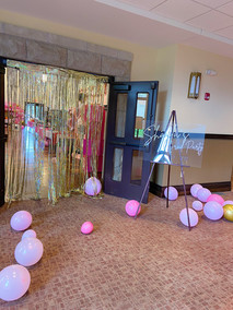 For the photo wall, we used balloons, a pink photography backdrop, and wrapped packing boxes with wrapping paper to have some fun props next to Shayla and her friends. I used my Cricut maker to cut out cardstock letters "GRAD" to tape on the boxes to stand out.